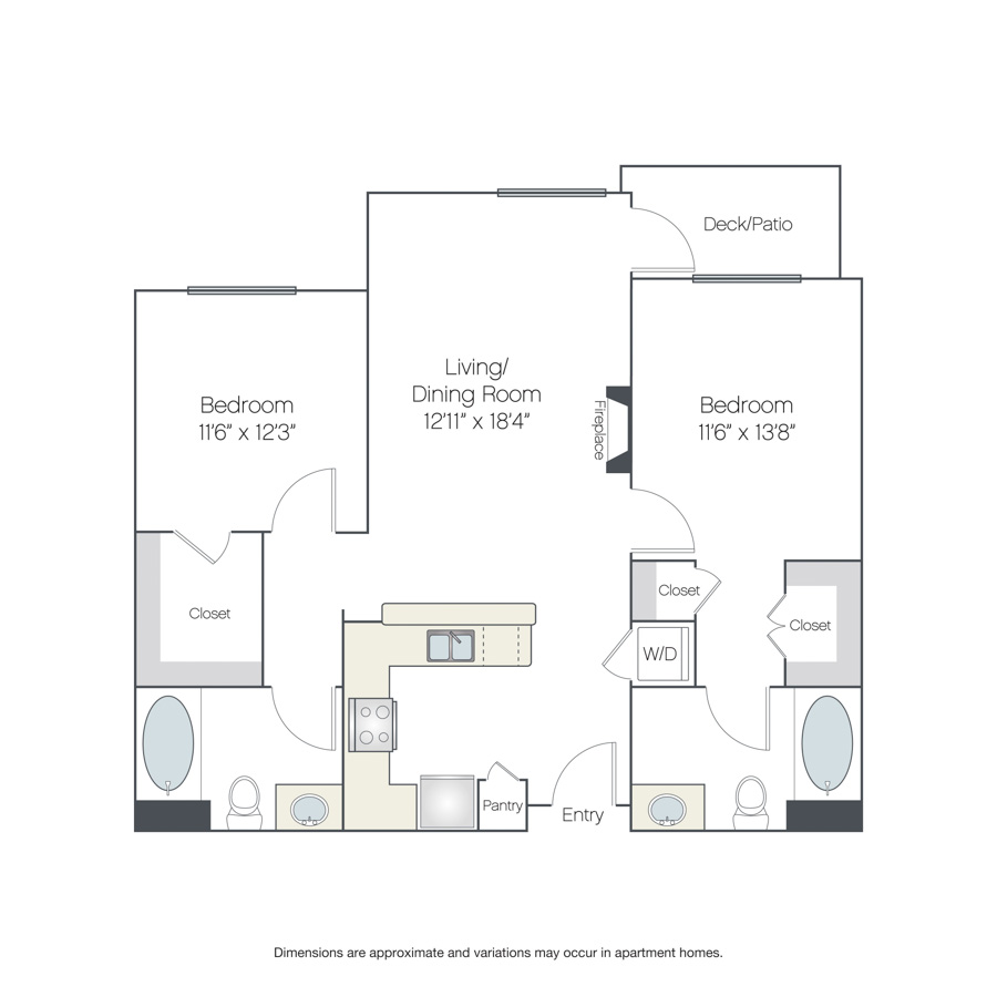 Rendering of the Schleck floor plan with 2 bedroom[s] and 1 bathroom[s] at Griffis Cherry Creek