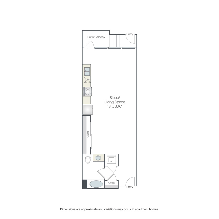 This studio, one-bathroom apartment for rent in San Diego features an open living area with closet storage and balcony. At the entry, you have access to an additional coat closet, the bathroom and in-home washer and dryer.