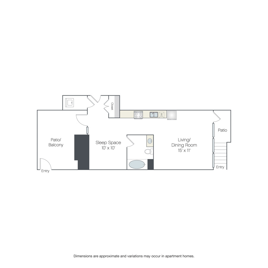This urban one-bedroom, one-bathroom apartment for rent features separate living and sleeping areas with a large private balcony, plus closet storage and in-home washer and dryer off the entry.
