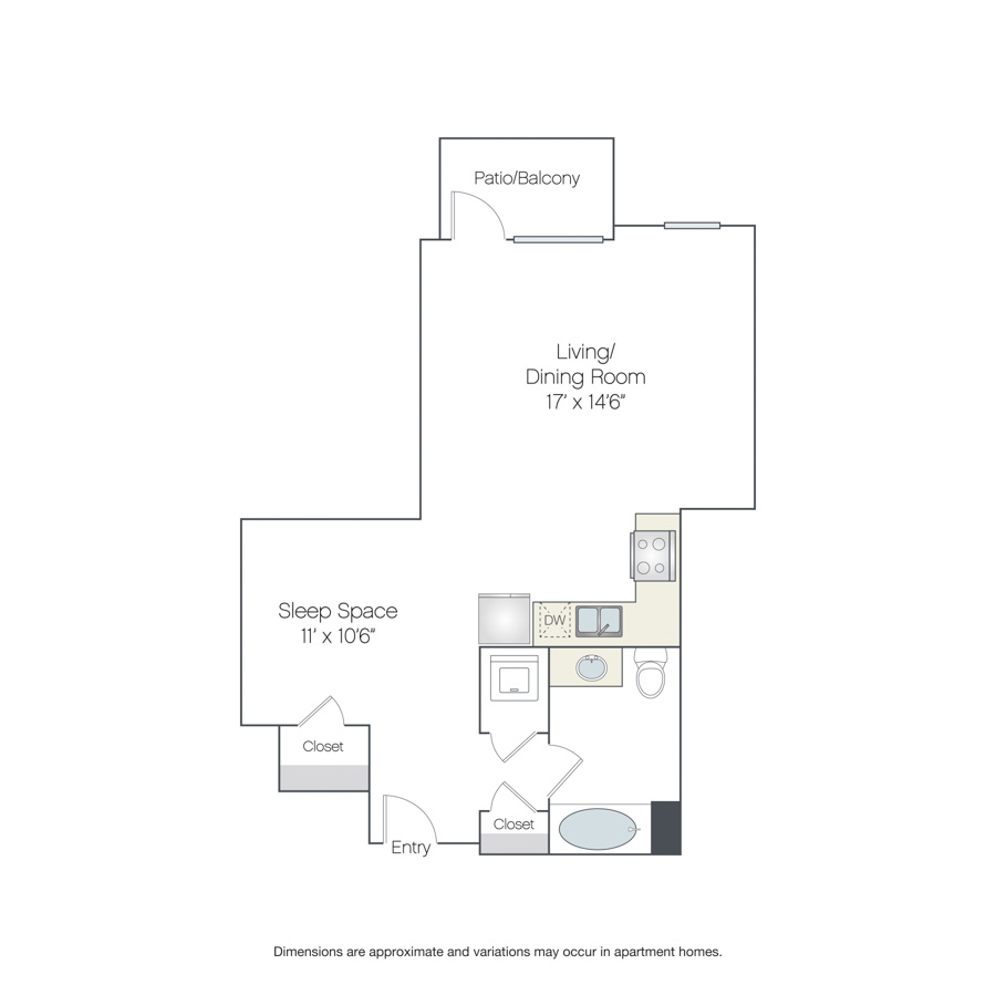 This studio, one-bathroom apartment for rent in San Diego features separate living and sleeping areas with a private balcony off the living space. The entry and bedroom areas include closet storage and there’s in-home washer and dryer next to the spacious bathroom.