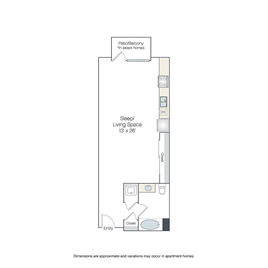 This studio, one-bathroom apartment for rent features an open living area that opens out onto a private balcony*, in-home washer and dryer and plenty of closet storage. *In select apartment homes.