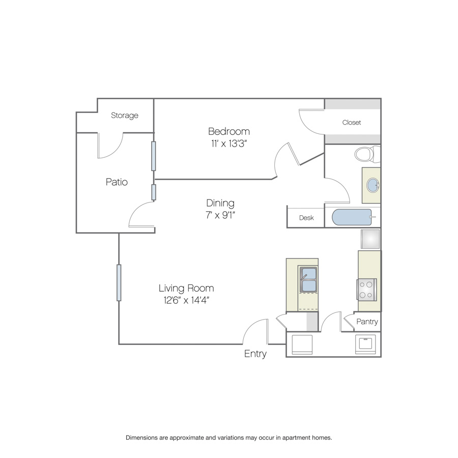 Rendering of the Rialto floor plan with 1 bedroom[s] and 1 bathroom[s] at Griffis North Creek
