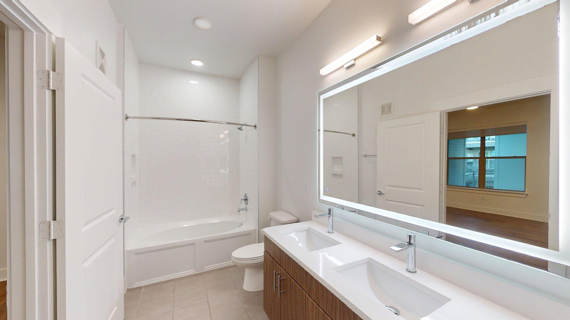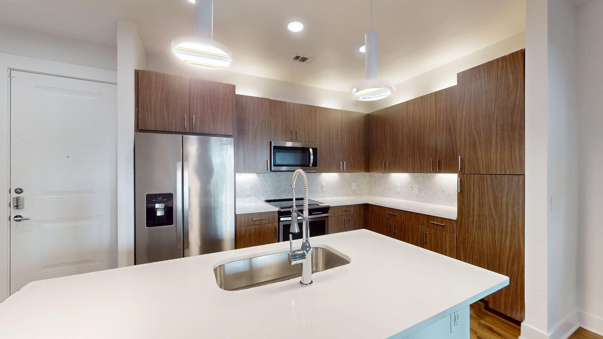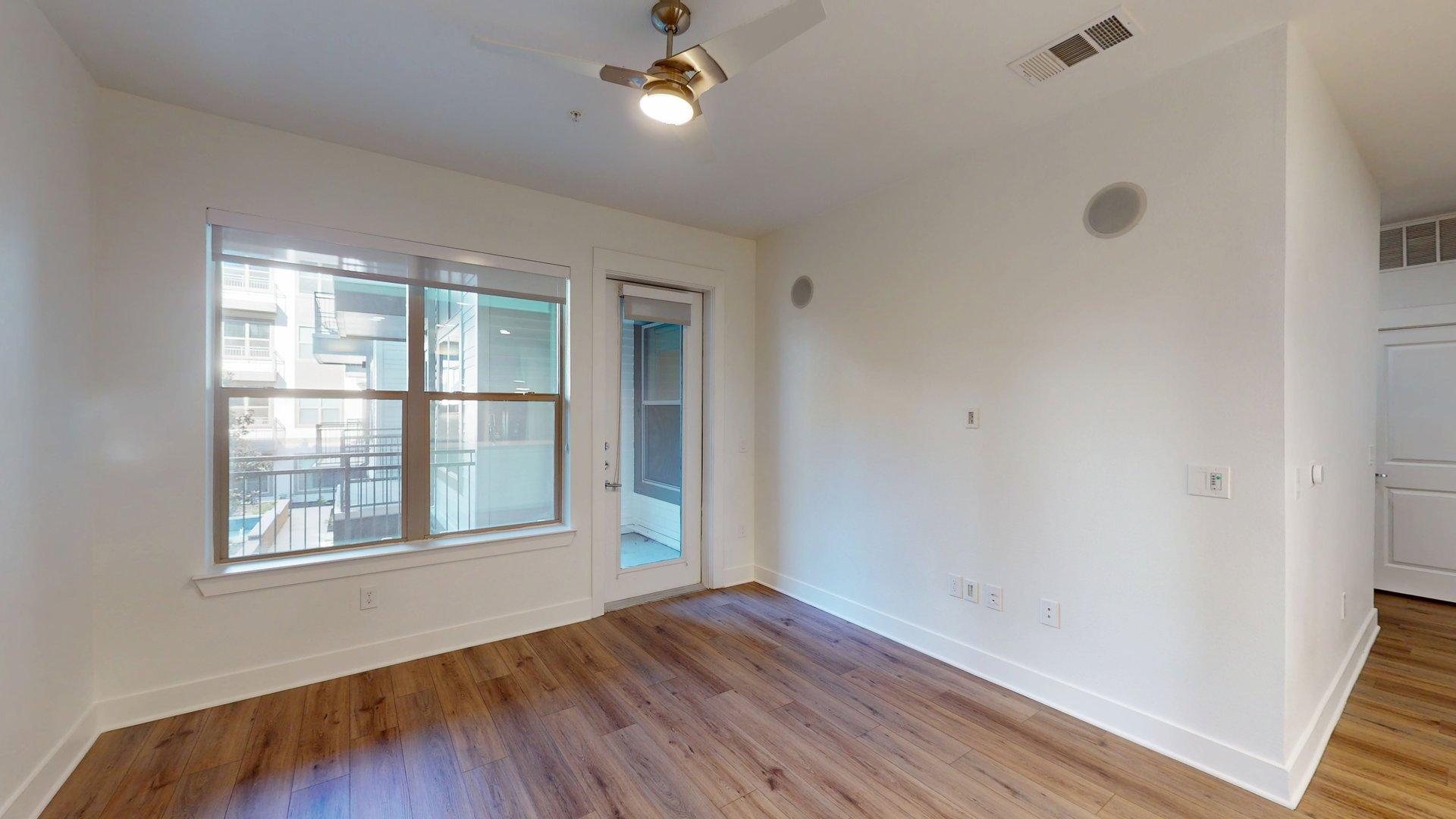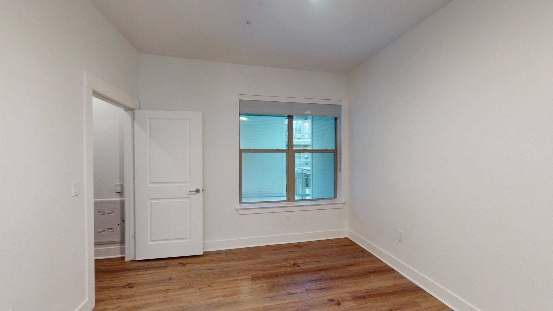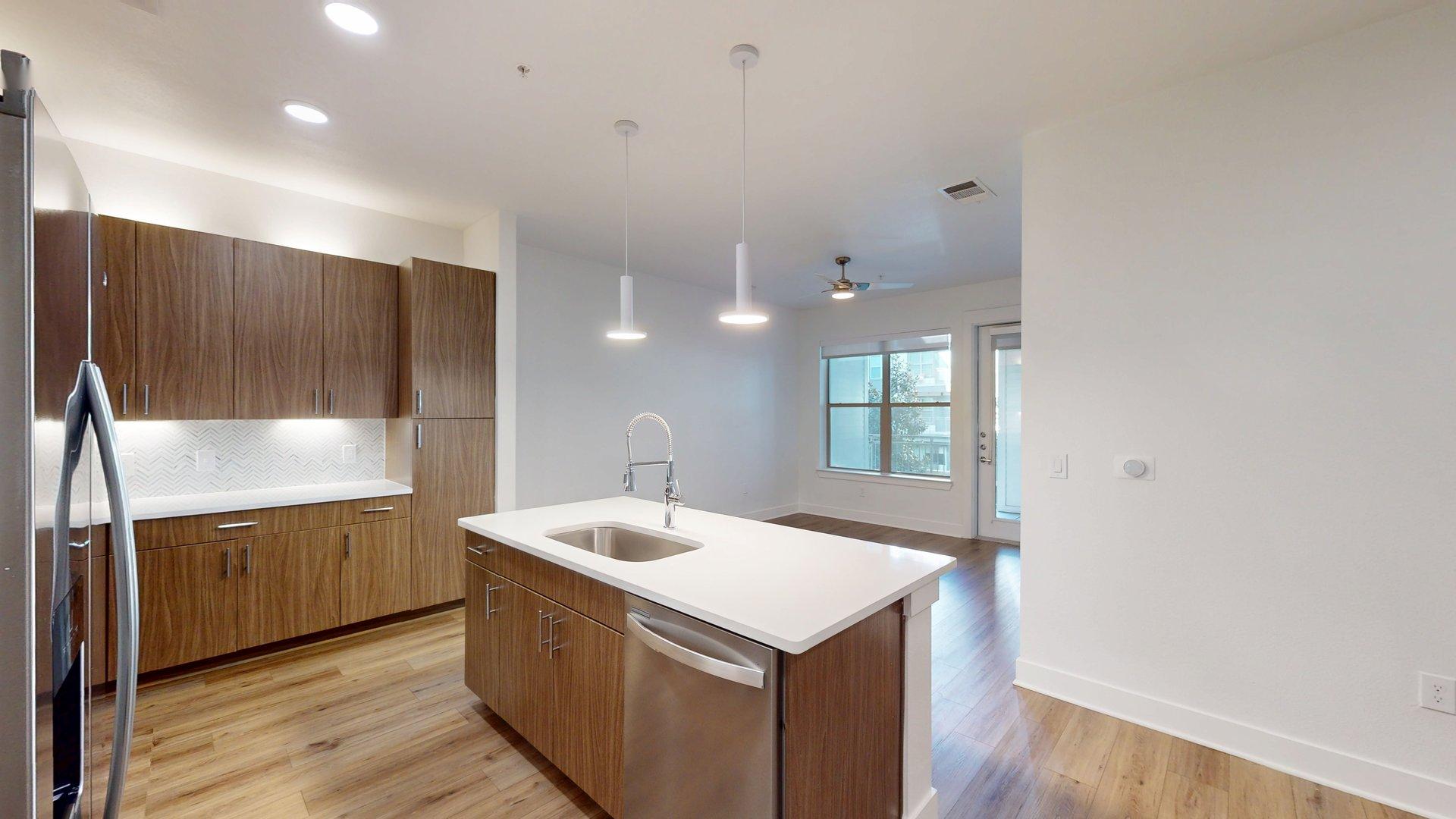 This one-bedroom, one-bath apartment home features an open living and dining area with plenty of space for entertaining. The open-concept kitchen flows seamlessly into the living space. The bedroom includes dual closets. Finish options vary by floor—light oak cabinets with white granite countertops are available on floors 0, 2, and 4, while walnut cabinets with black granite countertops are available on floors 1, 3, and 5. Polished concrete flooring is featured on floors 0 and 1, with wood-style flooring available on floors 2, 3, 4, and 5.