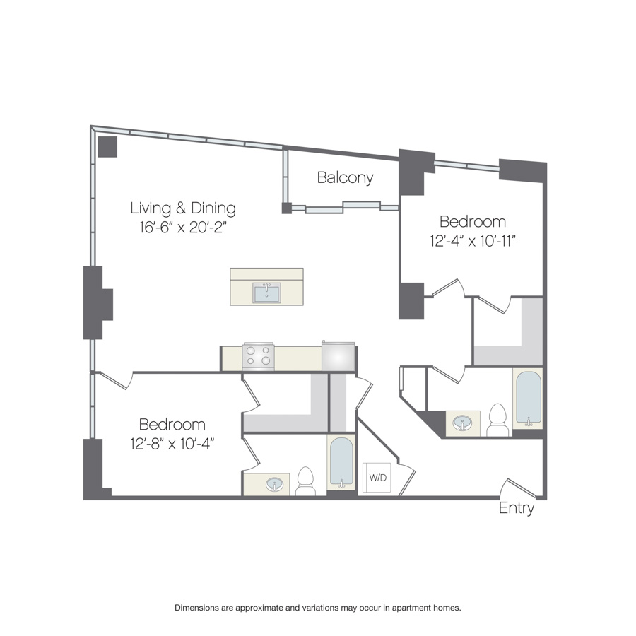 This two-bedroom, two-bathroom apartment home includes an open-concept kitchen that leads to a spacious living and dining room with a private balcony. The primary bedroom features a spacious closet and on-suite bathroom. The secondary bedroom includes a large closet. The foyer leads to an in-home washer and dryer.