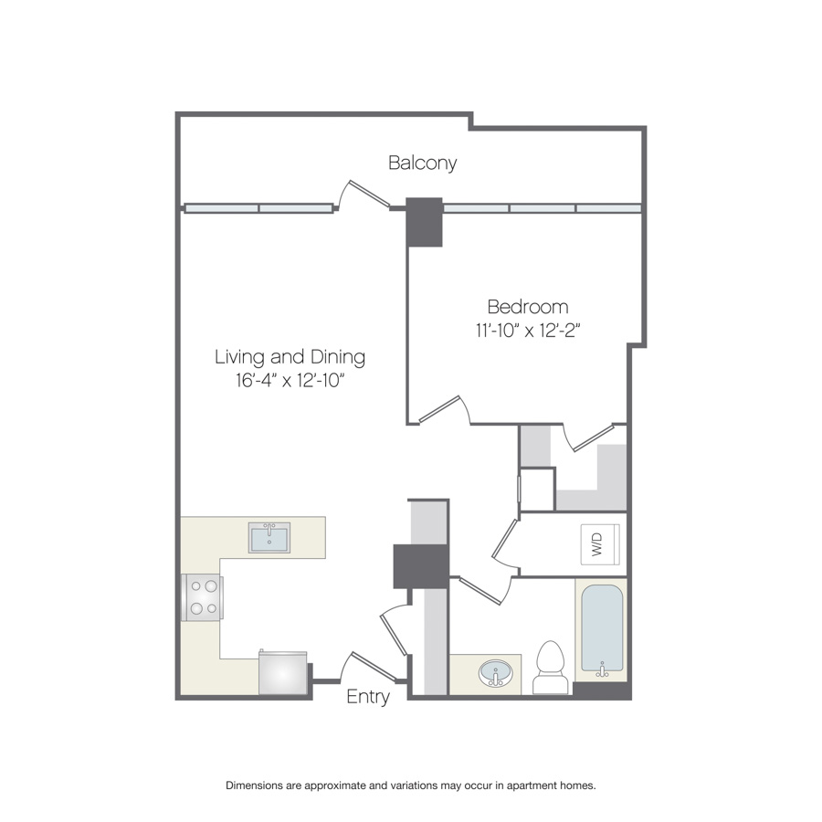 This one-bedroom, one-bath apartment home features an open-concept kitchen and spacious living/dining space. The bedroom contains a large closet and the bathroom is adjacent to an in-home washer and dryer.