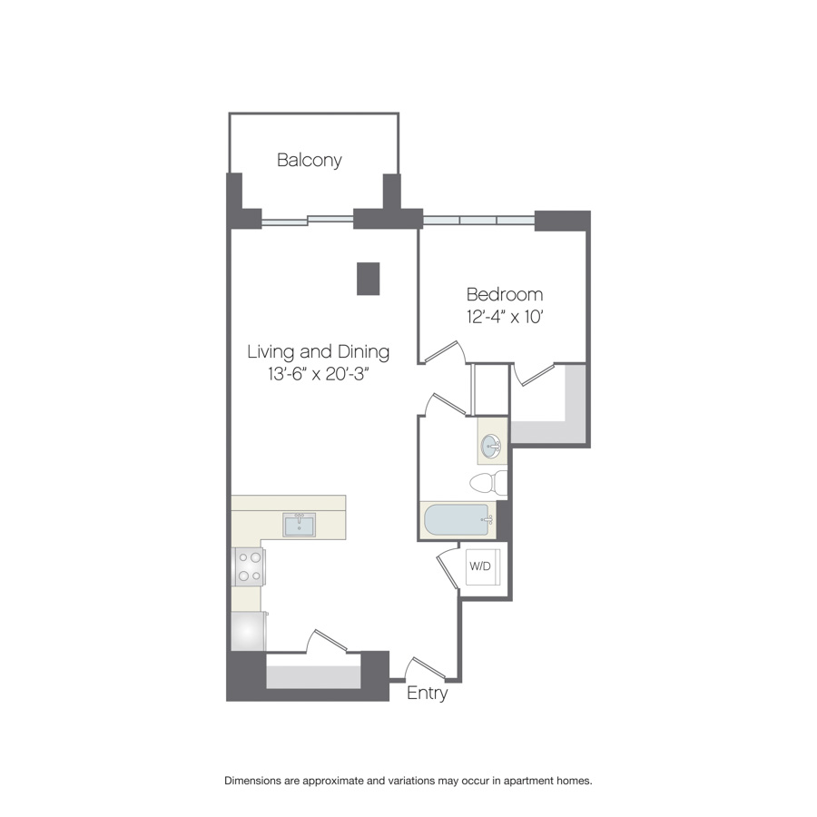 This one-bedroom, one-bath apartment home features an open-concept kitchen with ample counter space and opens to a large entertaining/dining room. The bedroom contains a spacious closet. The home includes an in-home washer and dryer and private balcony.