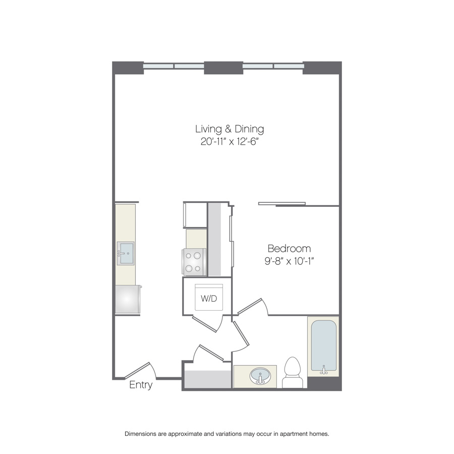 This studio, one-bath apartment home features a semi-private sleeping area. The kitchen opens to a large living/dining area. Included is an in-home washer and dryer.