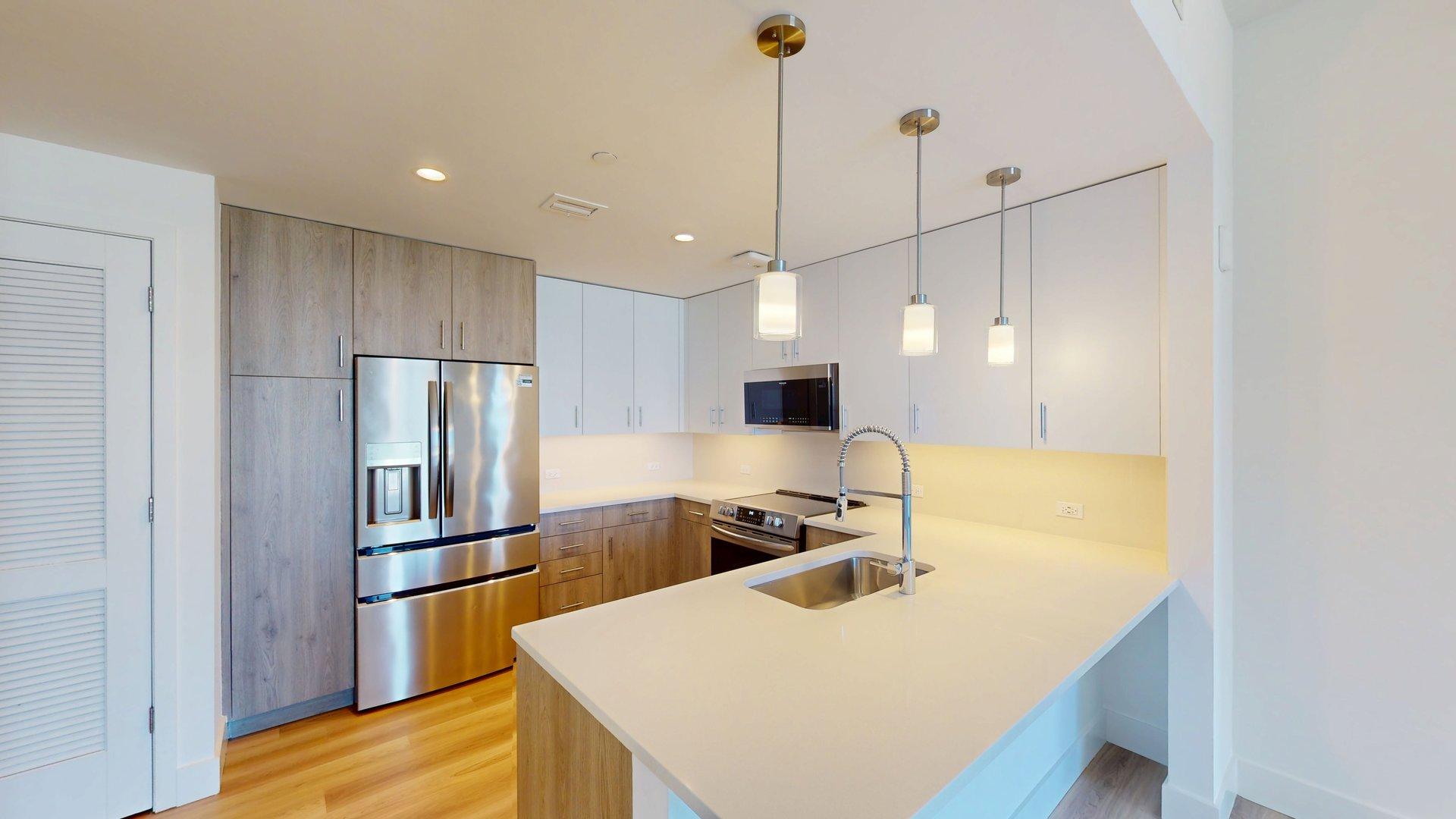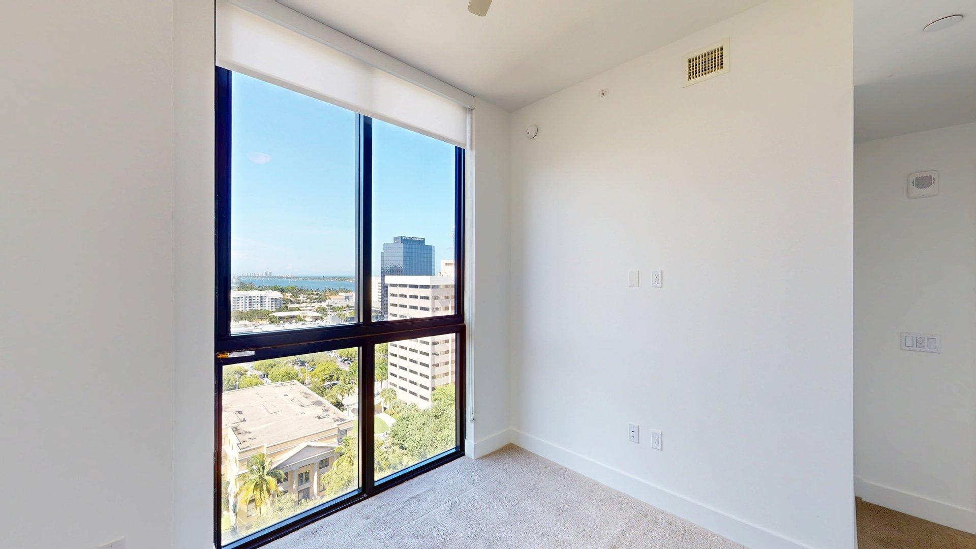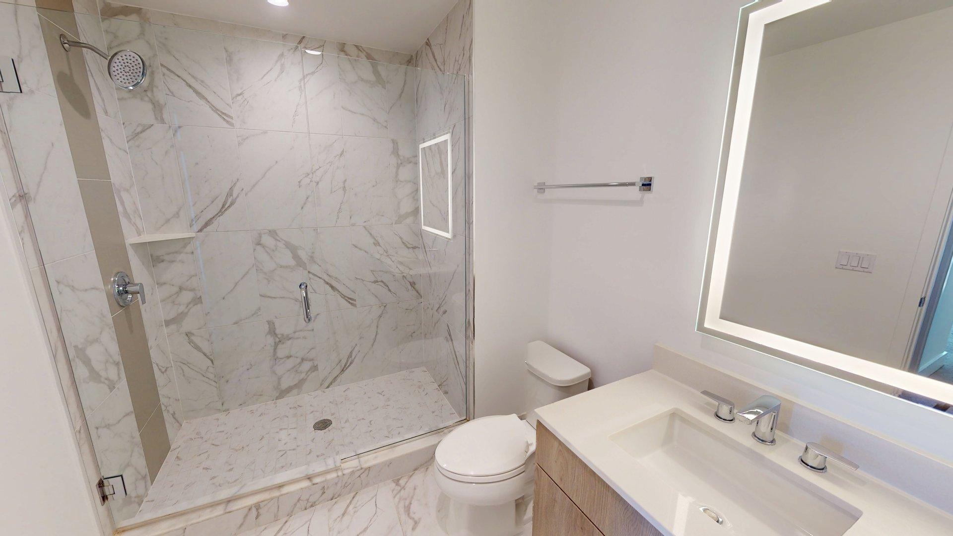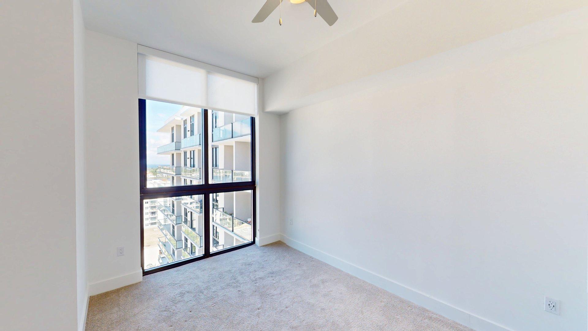 This three-bedroom, two-bath floor plan offers a spacious living area that opens to an extra large private balcony. The kitchen features a pantry and is positioned near the entry. The primary bedroom features a spacious closet and en suite bath. The other two bedrooms share a bathroom.